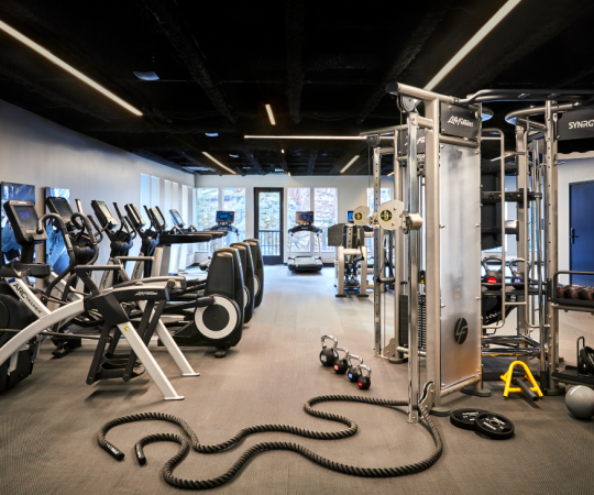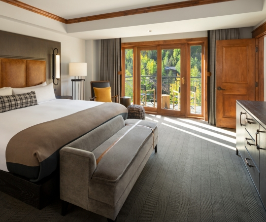 Guest Rooms: These thoughtfully designed rooms feature plush bedding, leather rocking chairs, and upscale amenities like Le Chemin by Byredo bath products, Frette robes, Lavazza coffee, and flat-screen TVs. Many rooms also include balconies with mountain views. Accommodating 2-4 guests and combining queen or king beds with sofa bedding or 2 double beds for groups of four.