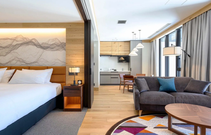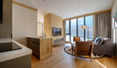 Perfectly proportioned with modern amenities and luxurious design touches, the Superior Suite is a slightly larger option, great for families and groups. Set over 95 sqm our Superior Suite comes with 2 Bedrooms and 2 Bathrooms, a large living area and a full kitchen perfect for dining in your suite in style. High speed internet is available throughout the hotel and this suite comes with a widescreen Smart TV. A desk is available in some rooms. Both alpine and ski resort views are available with this suite type for those who book early.