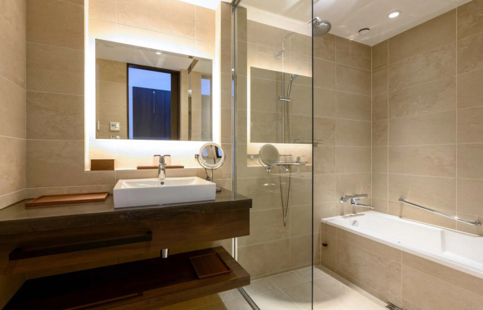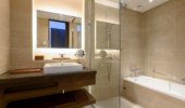 This spacious suite, ranging from 99 to 107 sqm, suite offers two bedrooms and two bathrooms, each with an ensuite. The master bedroom includes a king-sized bed, an ensuite bathroom with a bathtub, and windows offering plenty of natural light and stunning views. The second bedroom is equipped with two single beds and also has a private bathroom. This room includes a small window that provides natural light but cannot be opened.